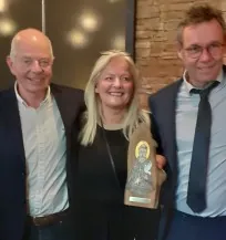Prismodtageren Steffen Knold (th) sammen med ikon-kunstneren Birgitte Hansen og Dyrenes Venners (DOSO’s) formand Peter Mollerup (tv).