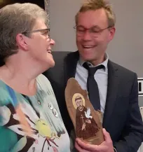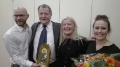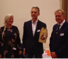 Billedet: I midten Hans Henrik Thomsen flankeret af formanden for Dansk Dyreværn Århus, Kalle Fisker (th) og ikonets skaber, kunstneren Birgitte Hansen (tv)