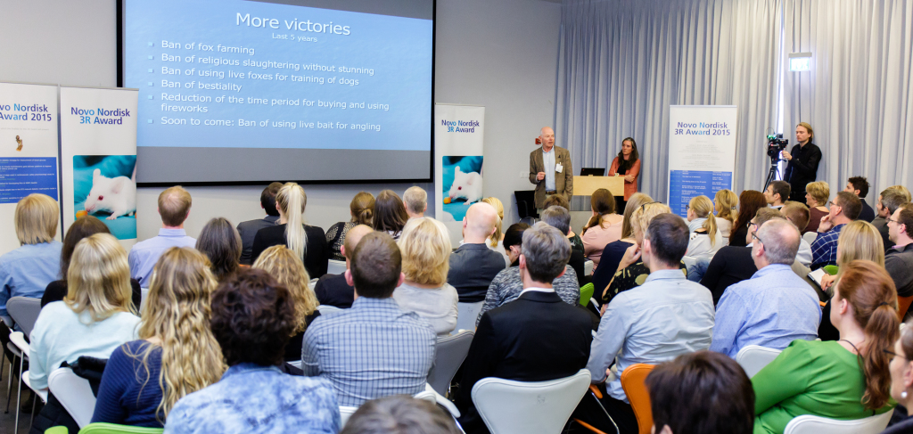 Et vellykket seminar på Forsøgsdyrenes Dag 2013. Formand for Dyrenes Venner, Peter Mollerup styrede de mange deltagere og oplægsholderne igennem dagen. Oplæg om alternative metoder til dyreforsøg i medicinal industrien og i undervisning samt spændende workshops bl.a. om bioetik. Fødevareminister Mette Gjerskovs oplæg omhandlede bl.a. det kommende 3R center.